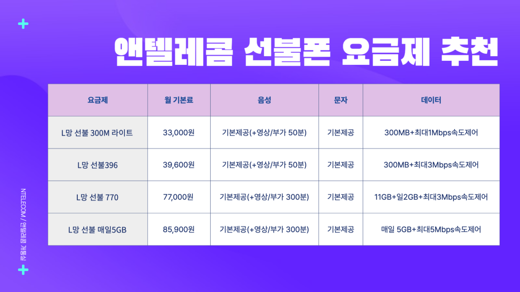앤텔레콤에는 다양한 요금제가 있습니다. 오늘은 앤텔레콤 L망의 요금제 중 인기 많은 요금제를 추천해드리려고 합니다. 가성비 좋은 요금제로 인기가 많고 많이들 사용하는 요금제이니 한번 확인해보세요.