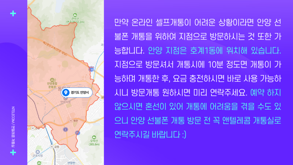 만약 온라인 셀프개통이 어려운 상황이라면 안양 선불폰 개통을 위하여 지점으로 방문하시는 것 또한 가능합니다. 안양 지점은 호계1동에 위치해 있습니다. 지점으로 방문셔서 개통시에 10분 정도면 개통이 가능하며 개통한 후, 요금 충전하시면 바로 사용 가능하시니 방문개통 원하시면 미리 연락주세요. 예약 하지 않으시면 혼선이 있어 개통에 어려움을 겪을 수도 있으니 안양 선불폰 개통 방문 전 꼭 앤텔레콤 개통실로 연락주시길 바랍니다 🙂